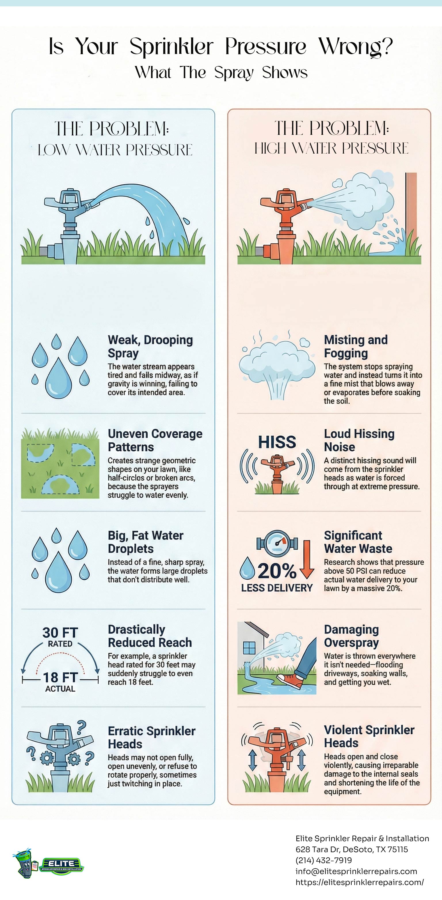 Most sprinkler problems come unannounced. However, it is easy to spot them. Dry patches and broken sprinkler heads are some of the most conspicuous signs of a sprinkler system under stress. Most of the time, you need to pay proper attention to the spray pattern to identify the underlying problem that is ailing the system. Uneven coverage or drooping water arcs are some of the telltale signs of low water pressure, whereas a loud hissing sound, fogging mist, and similar issues are some of the prominent signs of high water pressure. In both scenarios, water gets wasted. Either you will have to deal with an over-watered lawn or a parched one. This infographic helps you understand how water pressure can adversely affect the reach and efficiency of the sprinkler spray. It will also help you get a clearer understanding of different spray behaviors. Try not to ignore these signs because if they are ignored, these issues can have a major adverse impact on the lifespan of the sprinkler system.